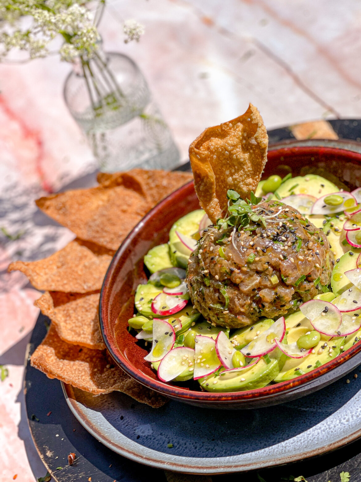 5. Serve with the crispy wonton chips and enjoy!