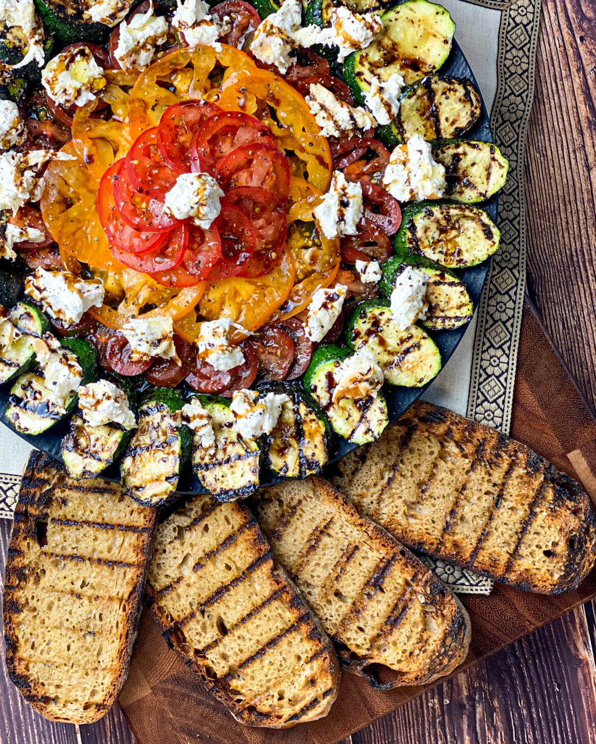 So easy… so satisfying and get that extra veg from the courgettes too… the perfect al fresco make your own toasties! Love Burrata?? Ever tried Smoked burrata? Still creamy and oozy but with a depth of woody smokiness… so indulgent… then matched with juicy heirloom tomatoes and char grilled courgettes… OMG… so so good. Don’t worry if you can’t find smoked burrata as any burrata works beautifully here!
