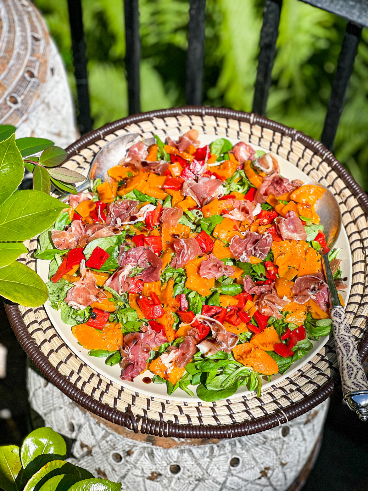 I made this salad a few weeks ago for my family who were visiting and served it with a curry leaf butter roast chicken… they all LOVED it… surprisingly even the ones that don’t really like butternut squash enjoyed it! I think the sweet, caramelised butternut squash combines so beautifully with the salty, savoury prosciutto… whats not to love?? Perfect on top of crisp greens drizzled with olive oil and balsamic vinegar… YUM!… I happily devoured the leftovers for lunch the next day too.