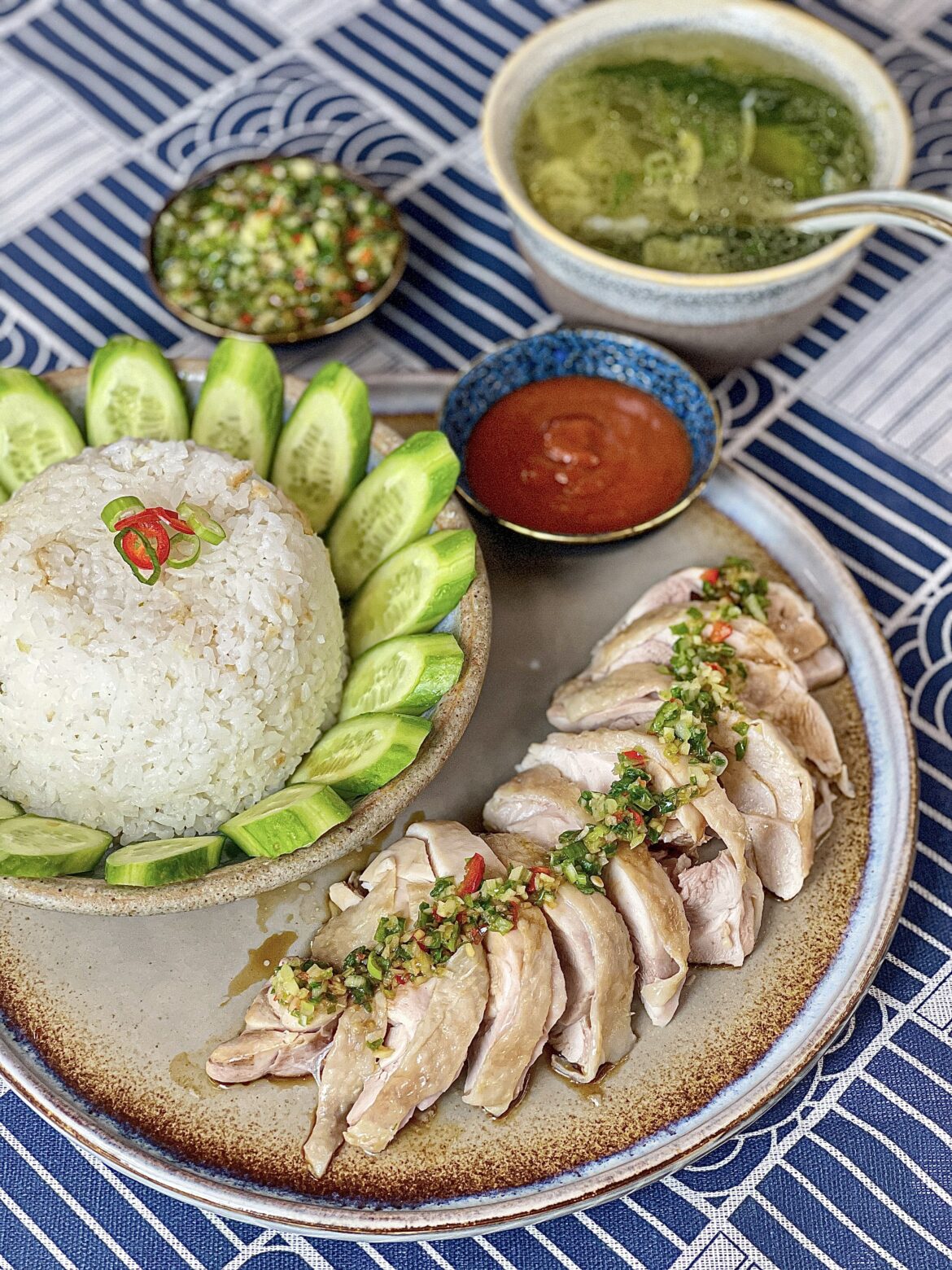 9. Serve the sliced chicken with Jasmine rice, the poaching soup, the remaining spring onion sauce, sliced cucumbers, some soya sauce and your favourite chilli sauce