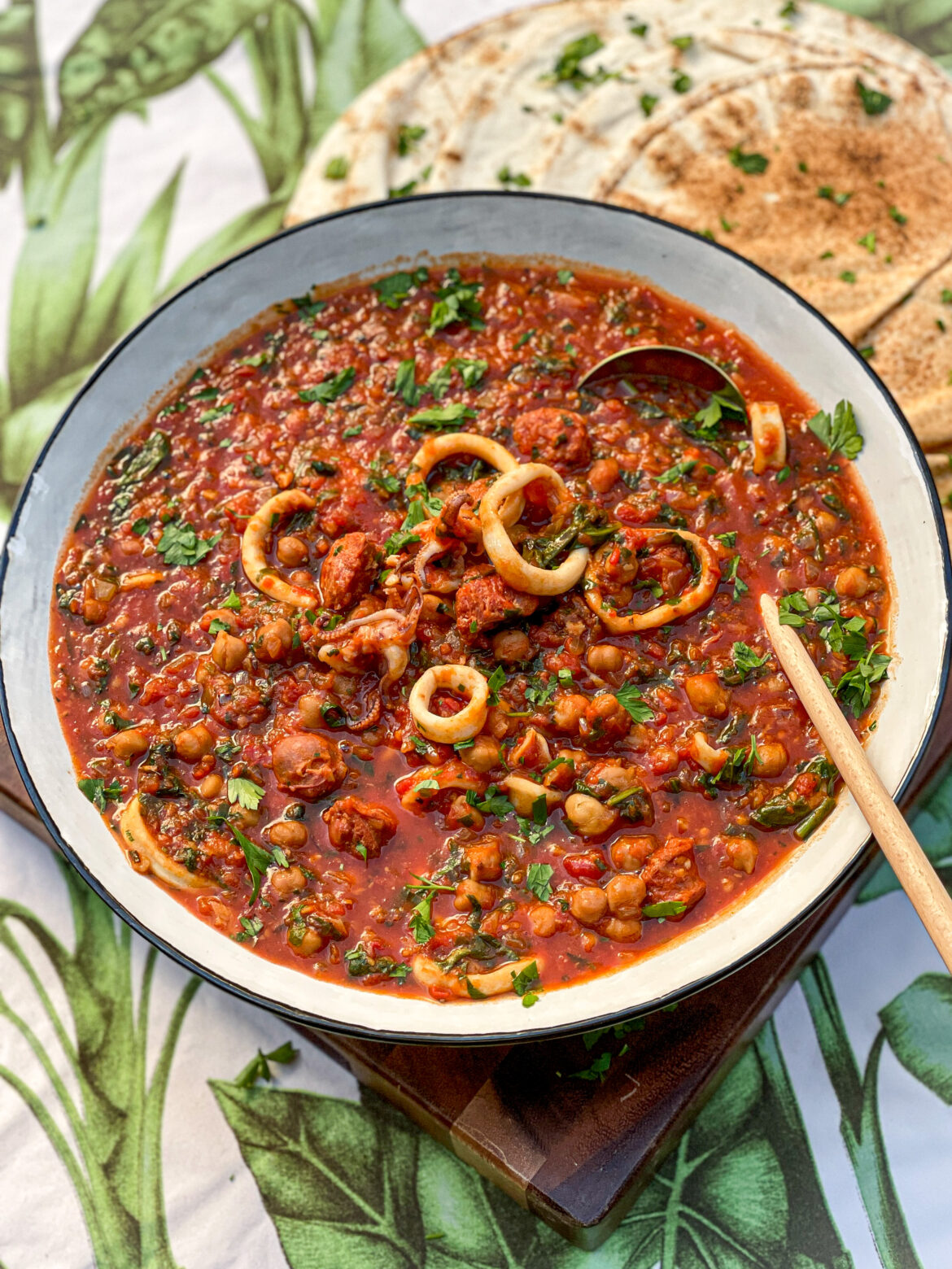 The base is a rich tomato broth simmered with nutty chickpeas and bites of spicy chorizo sausage, the calamari adds a gorgeous tender texture and each bite is just bursting with flavour.