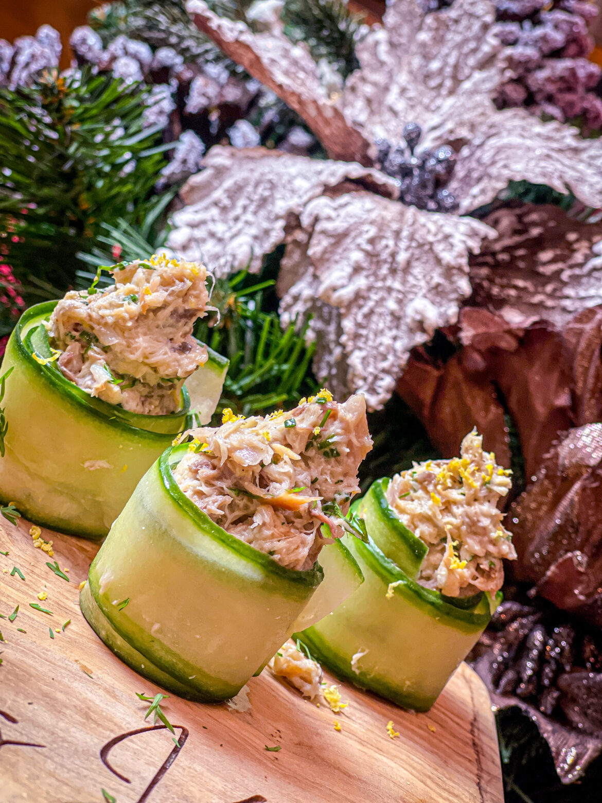 4. Lay a cucumber strip on a chopping board and place about a tablespoon of the mixture on one end, carefully roll to create a cylinder shape, top with more filling and garnish with the reserved lemon zest