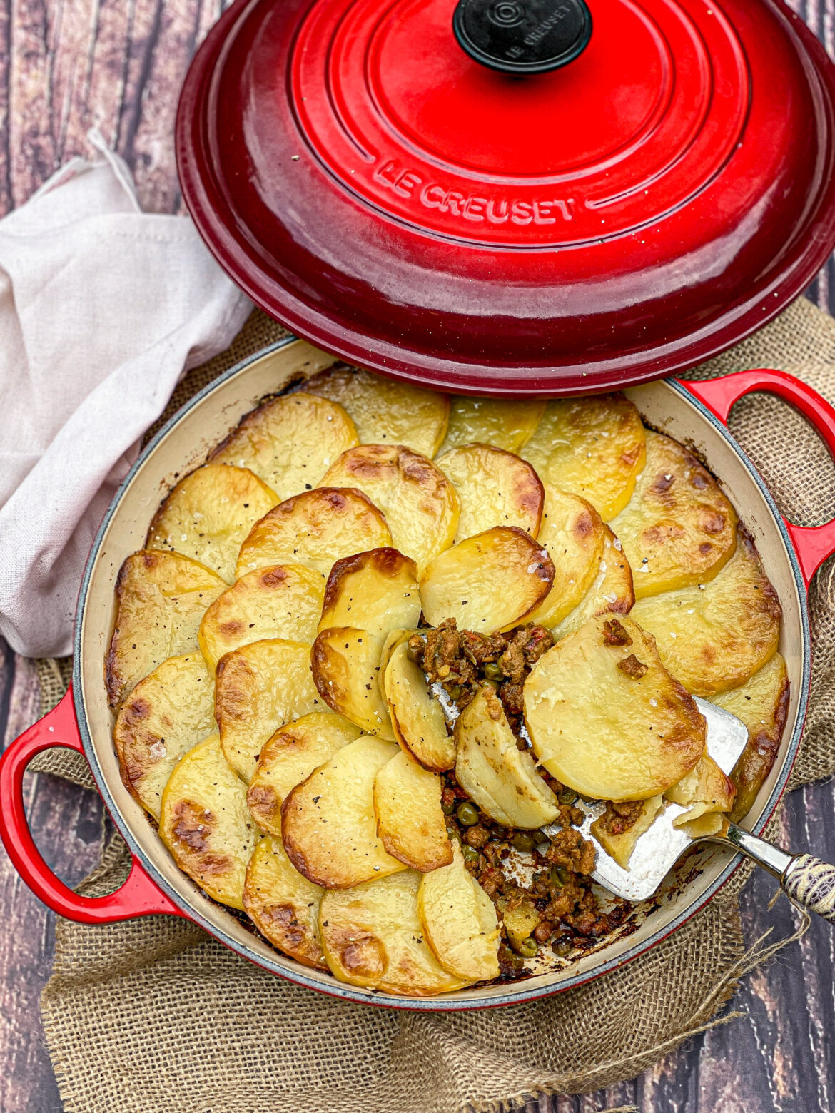 Punjabi Mamas Keema is a staple in our house… I always double the recipe to freeze a few containers because it’s so versatile… sometimes we eat it with rice, roti/ chapati, I give it to the kids often in a taco or tortilla and my favvvv way to eat Keema is with buttery, crisp scalloped potatoes on top!