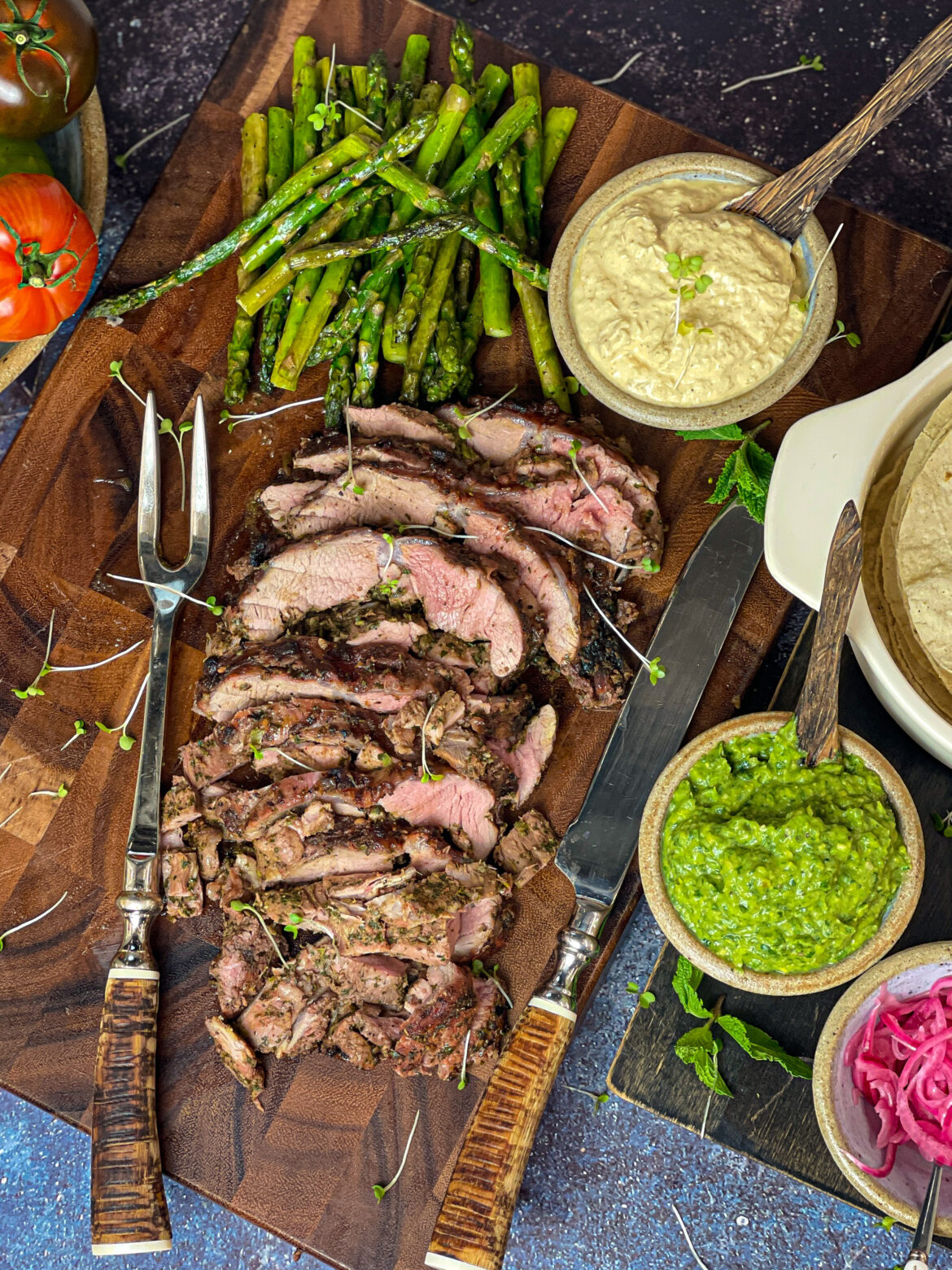 With Avocado Chutney, Lime pickle Raita, Pickled Red Onions & Corn Tortillas… A twist on a regular saddle of lamb… all spiced up and stuffed into tortillas with a delish spicy avo chutney and and a creamy tart raita and pink picked onions… a match made in heaven!!