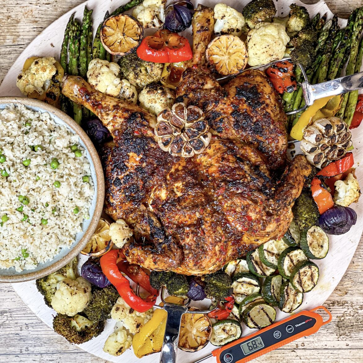 Soooo easy to make…. just get the butcher to spatchcock the chicken for you, blitz the paste in the food processor, marinate and cook in the oven.  I served my peri peri chicken with a coconut rice and char grilled veggies… finger licking good!!
