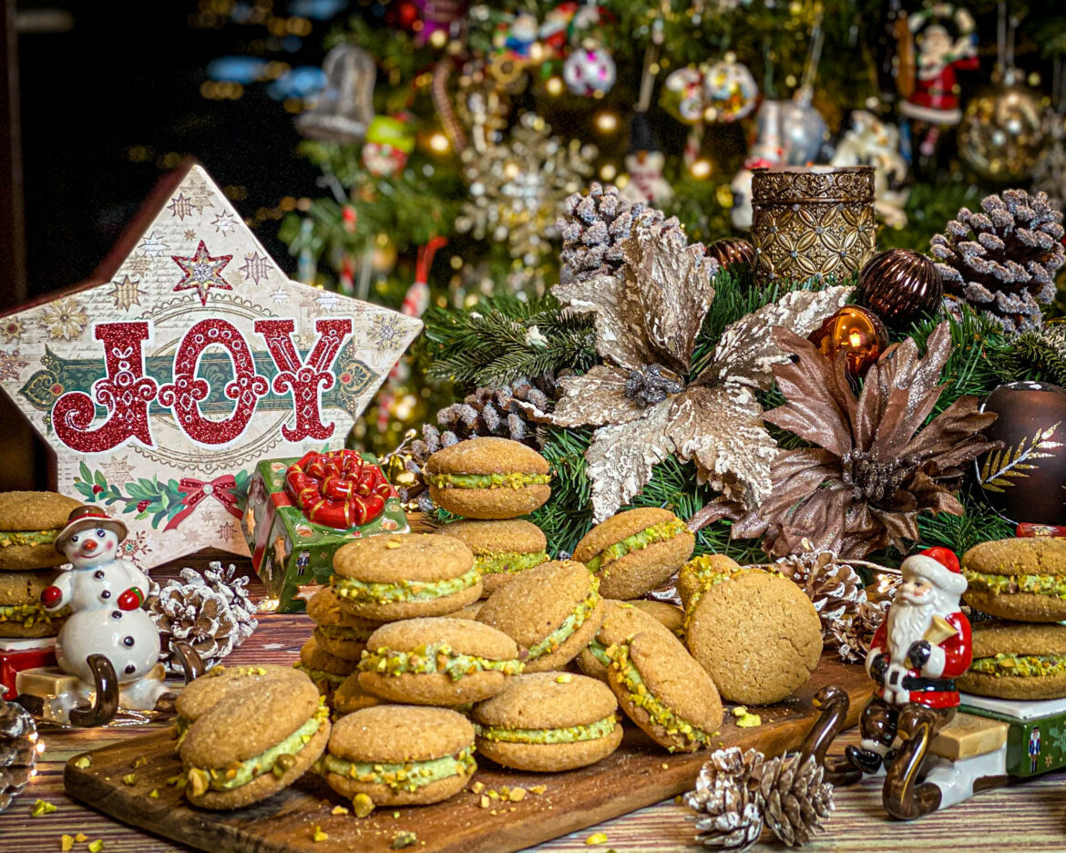 Soft, thick and chewy cookies spiced with warm and cosy cardamom, cinnamon and ginger, sandwiched between a decadent pistachio buttercream… the ultimate Christmas cookie!!