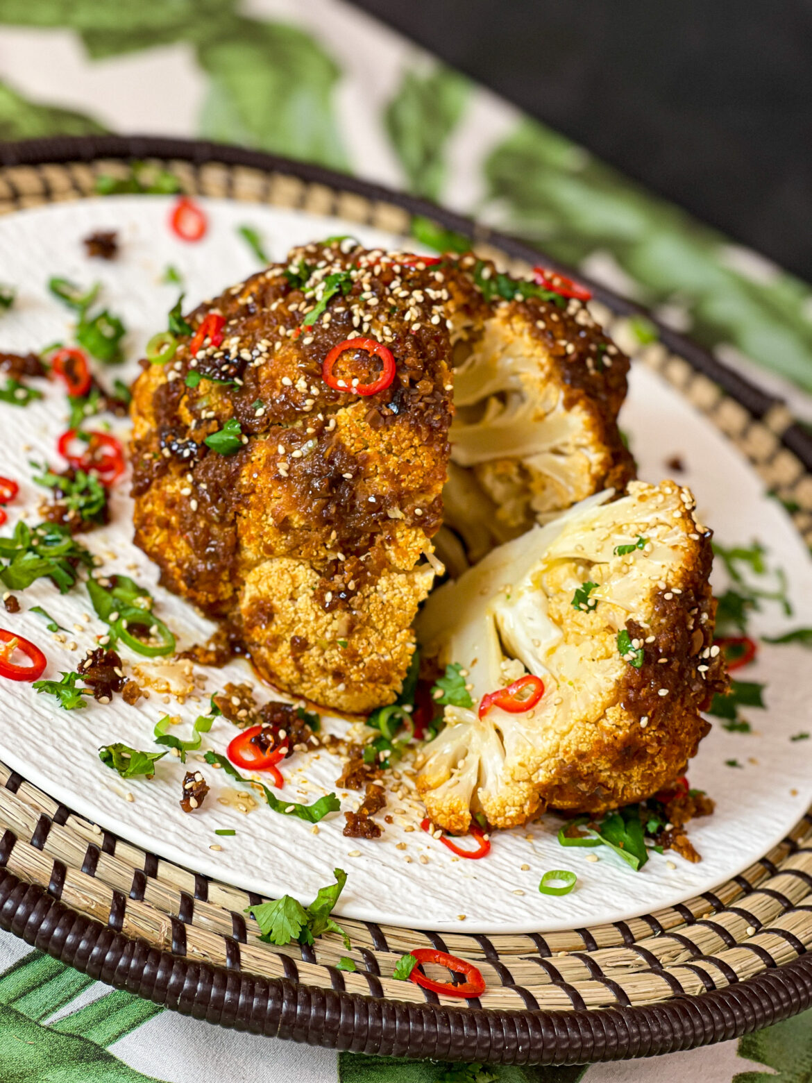 Smothered in the most delish, decadent peanut sauce and roasted to tender perfection this cauliflower takes just minutes to prep with the oven doing all the hard work for you…  a wonderful vegetarian main to serve as a side dish, just slice into wedges at the table.