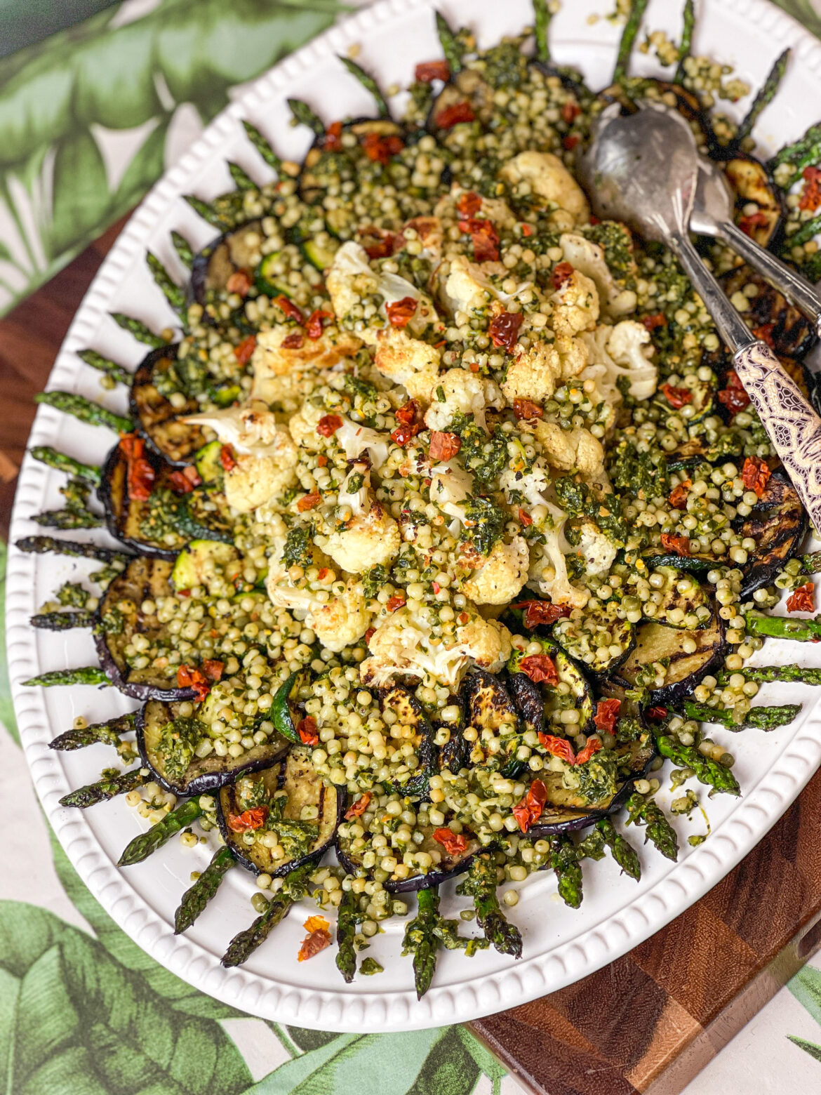 A simple but very delicious salad for you today! The skin of the aubergine and courgette gets smoky, and charred while the flesh is soft and juicy, the couscous gives a lovely texture to the salad while the semi-dried tomatoes are a sharp contrast to the creamy cheesy pistachio pesto… the perfect salad in my opinion!!