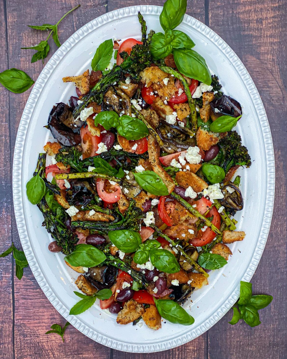 Crisp asparagus, crunchy tender stem broccoli and smokey aubergine, all charred on the BBQ grill, add that to some beautiful juicy tomatoes @iowtomatoes rich kalamata olives, homegrown basil, garlic croutons and a crumbling of salty feta—such a delicious combo of flavours and textures going on here.