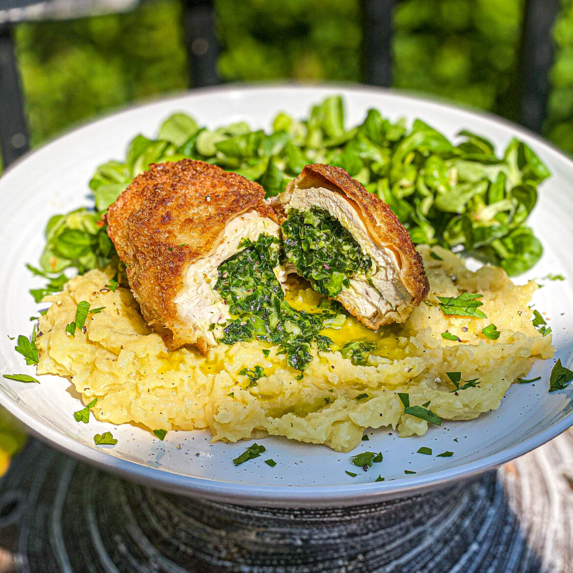 Juicy chicken breast with a golden crisp coating is sliced open to reveal ooooozing wild garlicky lemony butter, making every bite burst with flavour. This chicken Kiev is in a league of its own!